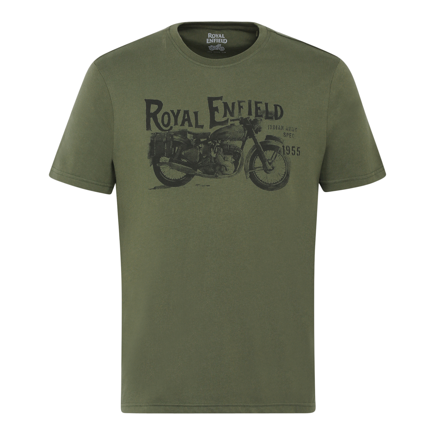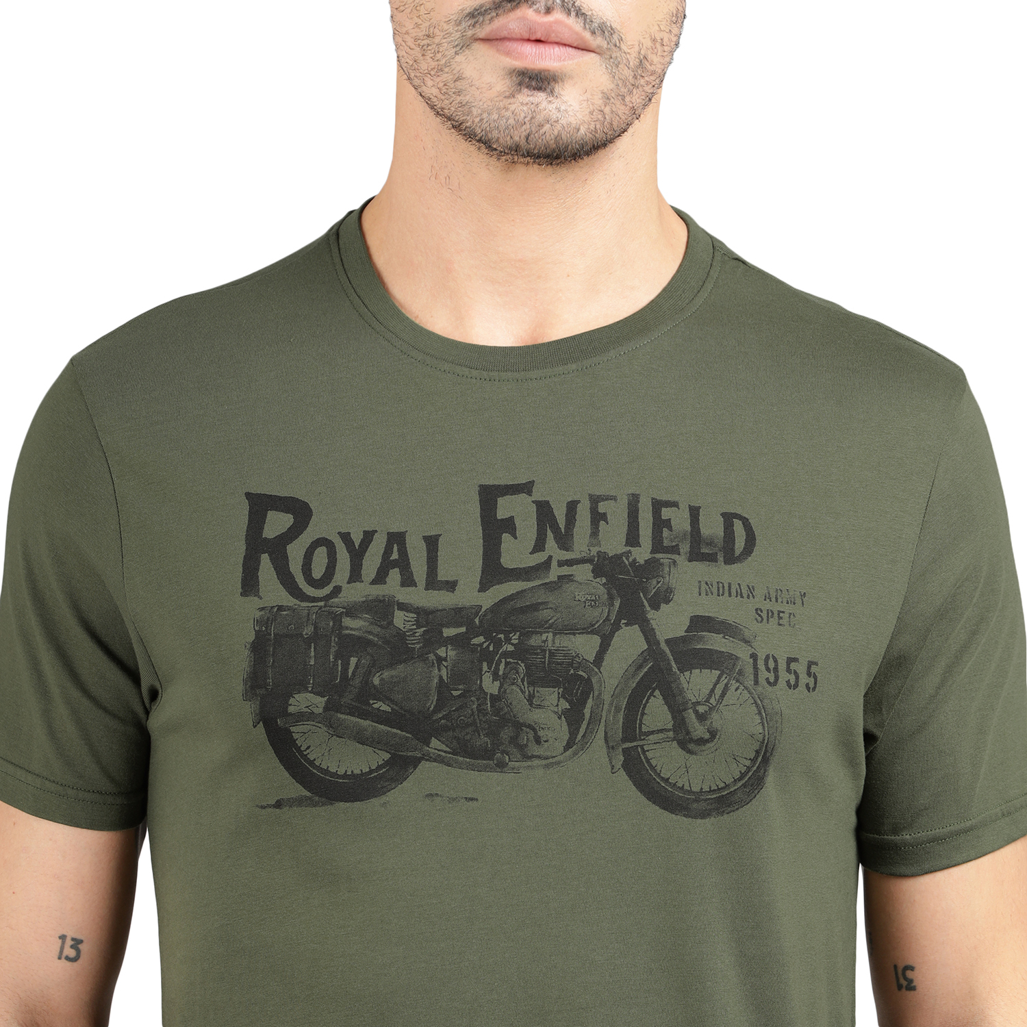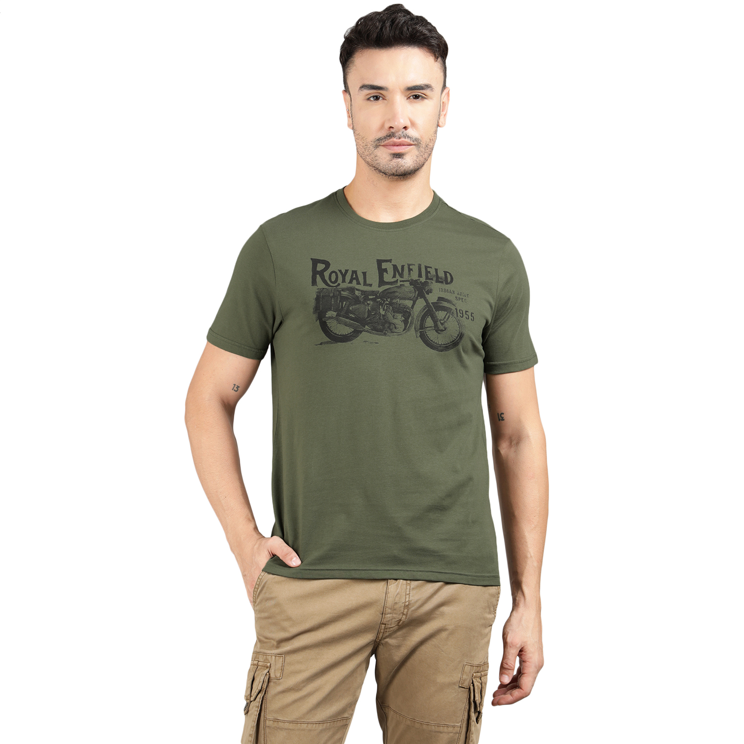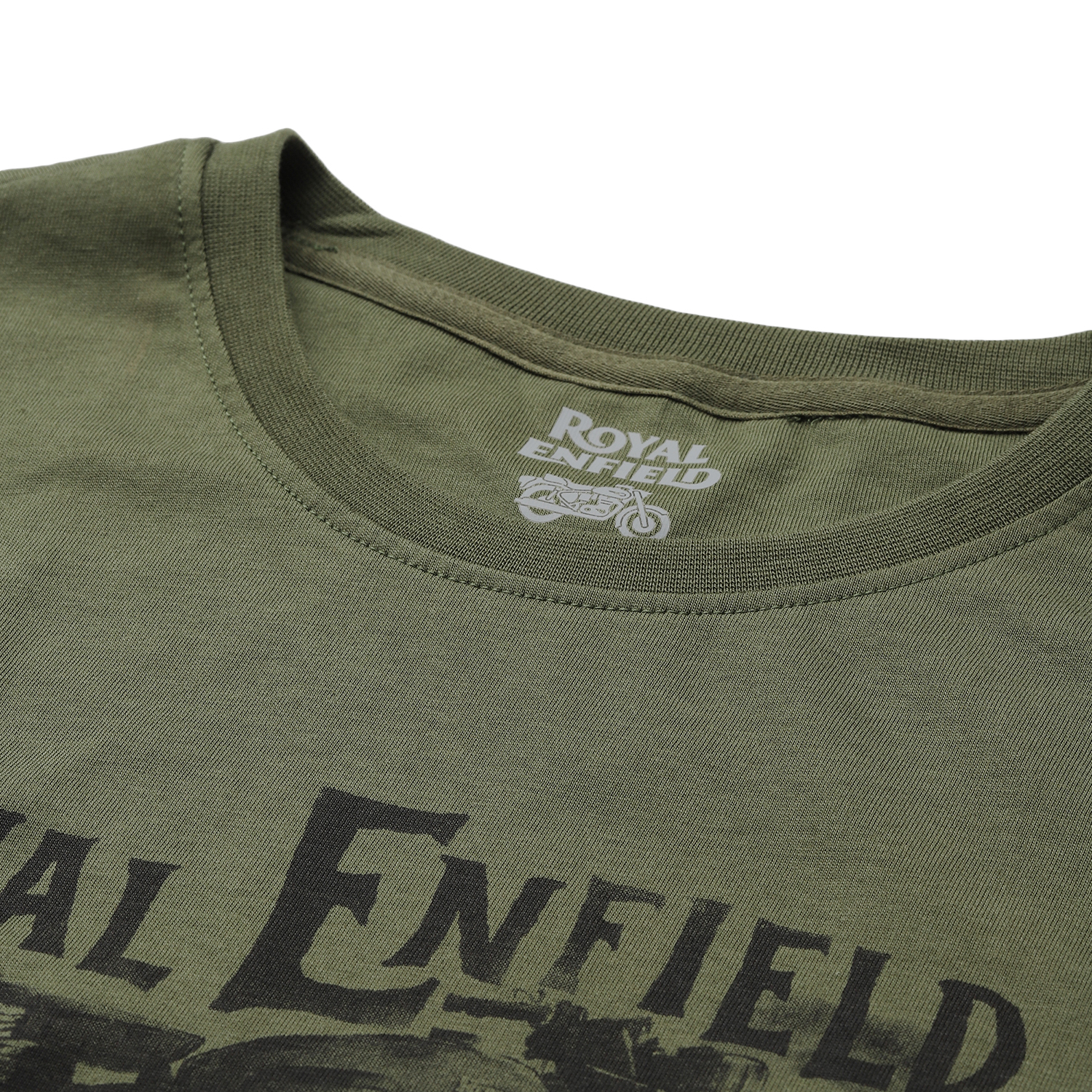 Футболка из линейки повседневной одежды Royal Enfield, выполненная из 100% хлопка. Изделие имеет классический крой, круглый вырез горловины и короткие рукава. Основной тон — оливковый. На передней части нанесен графический принт, отсылающий к культовой модели Bullet 350, что подчеркивает принадлежность к бренду. Материал обеспечивает комфорт и воздухопроницаемость при повседневной носке.