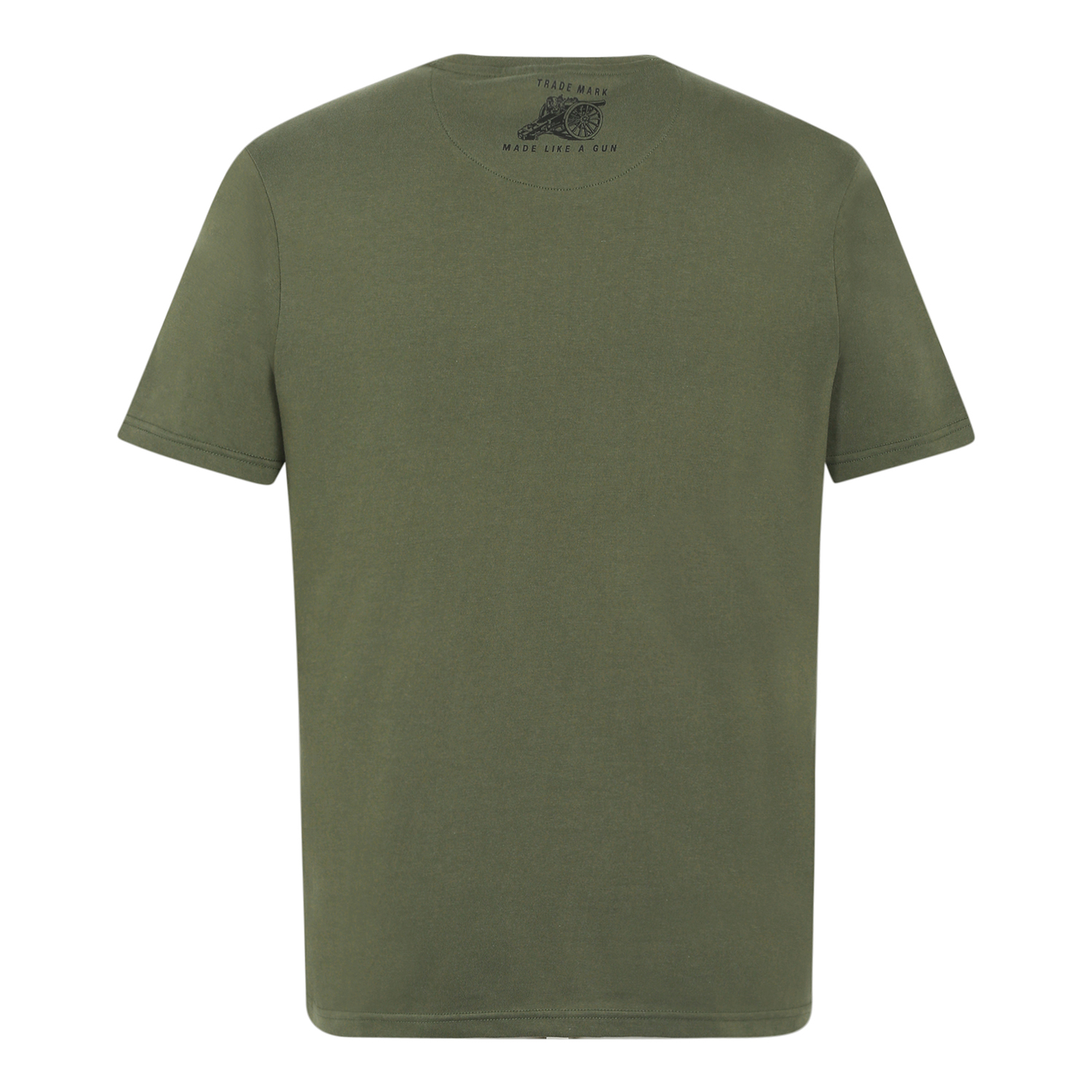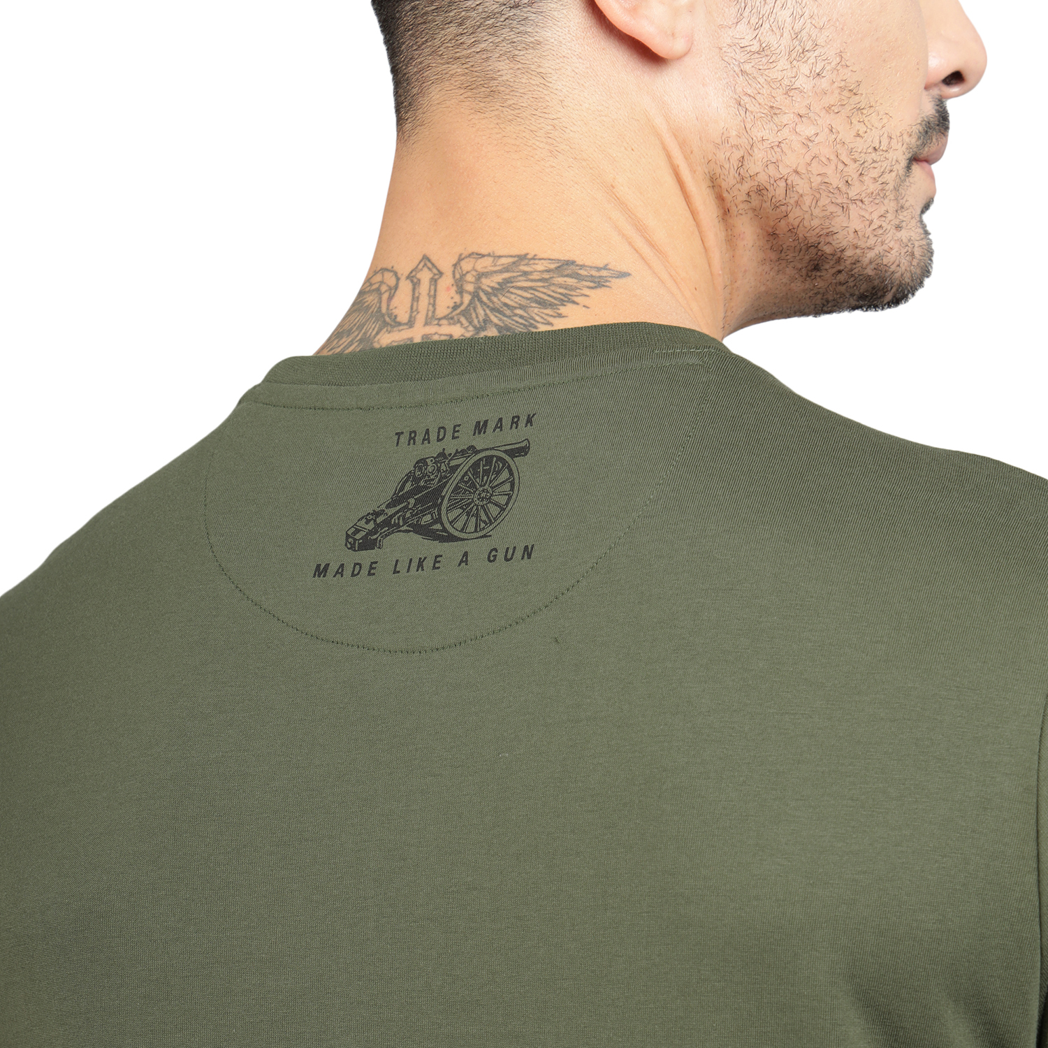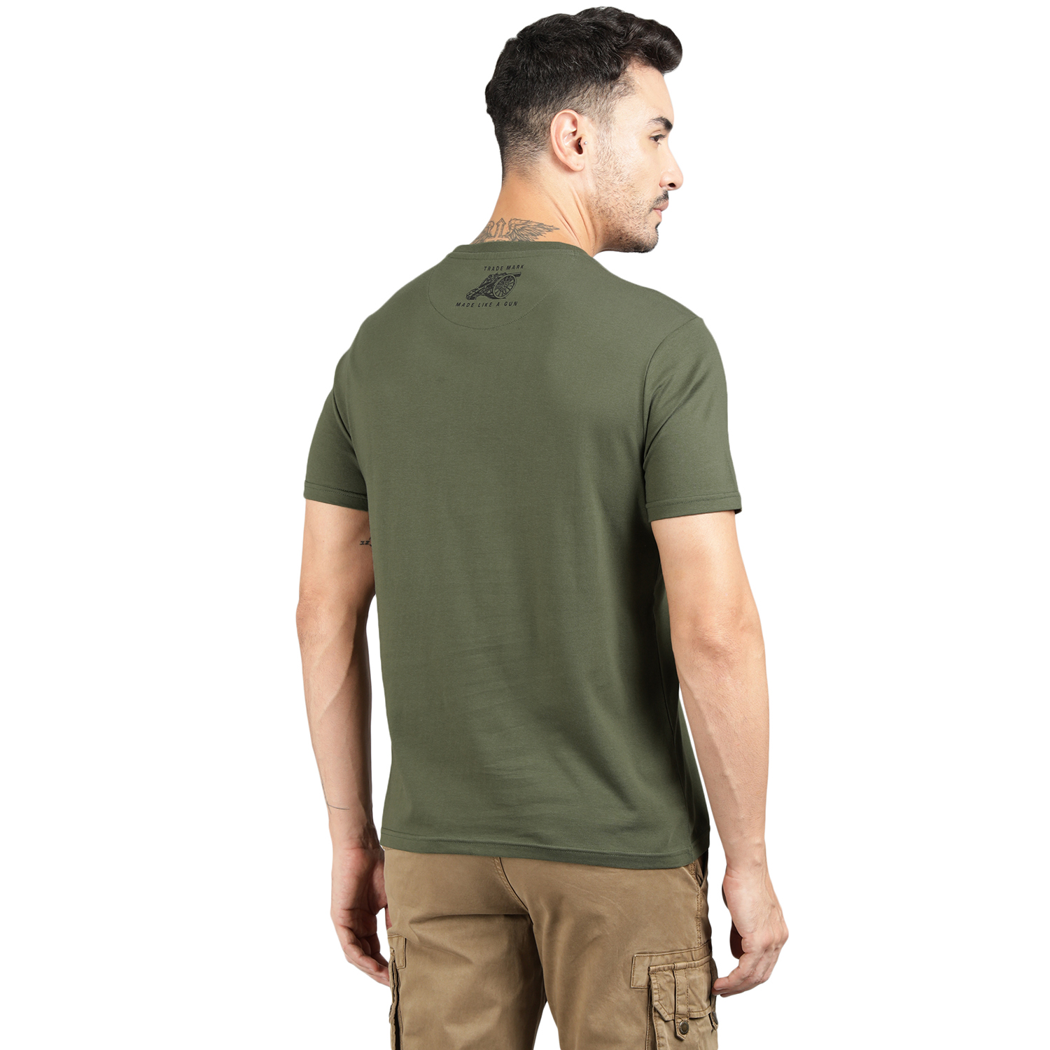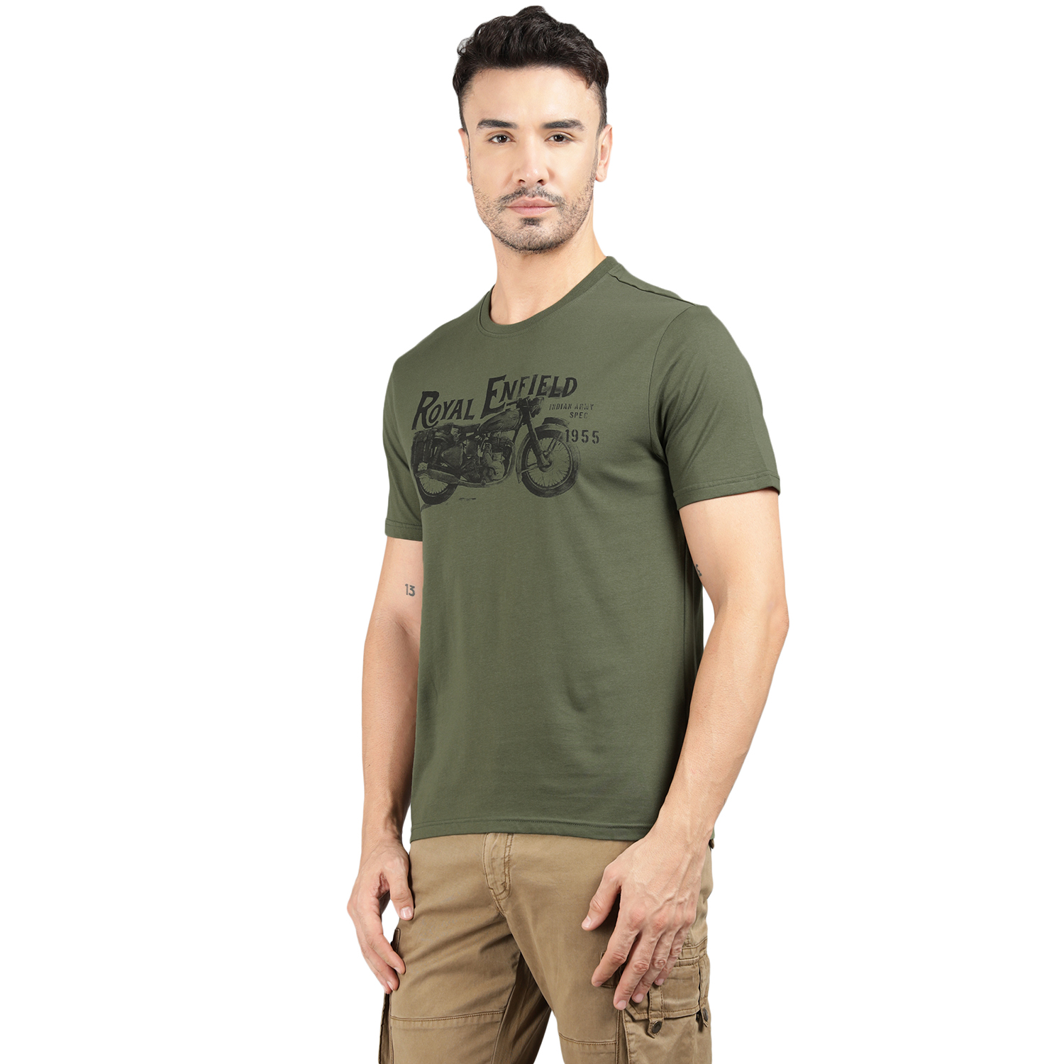 Футболка из линейки повседневной одежды Royal Enfield, выполненная из 100% хлопка. Изделие имеет классический крой, круглый вырез горловины и короткие рукава. Основной тон — оливковый. На передней части нанесен графический принт, отсылающий к культовой модели Bullet 350, что подчеркивает принадлежность к бренду. Материал обеспечивает комфорт и воздухопроницаемость при повседневной носке.