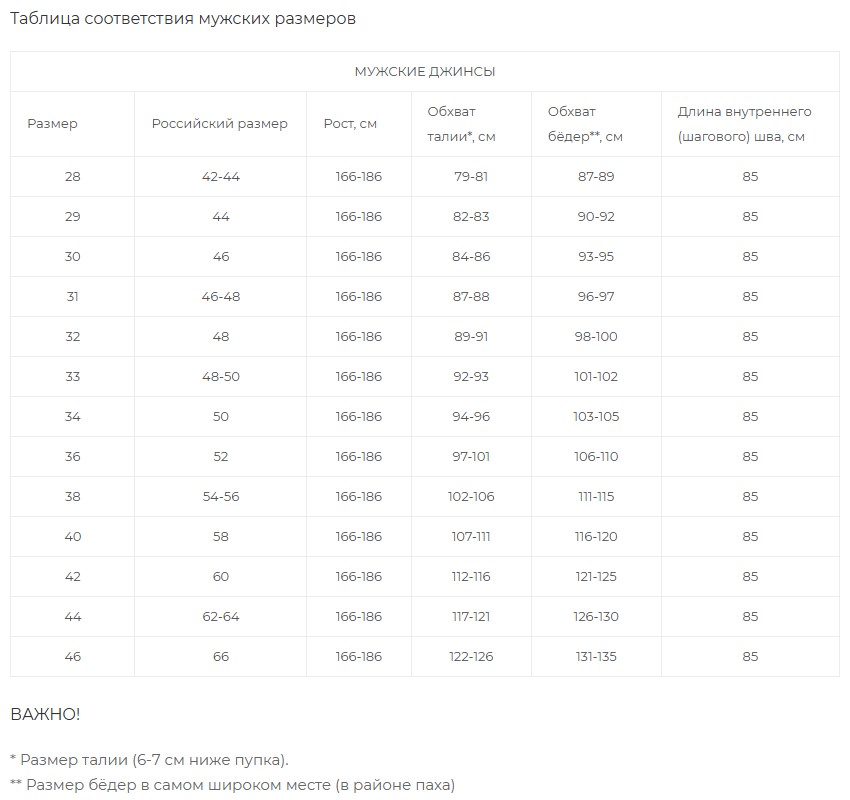 | Размер | Российский размер | Рост, см | Обхват талии*, см | Обхват бёдер**, см | Длина внутреннего (шагового) шва, см |