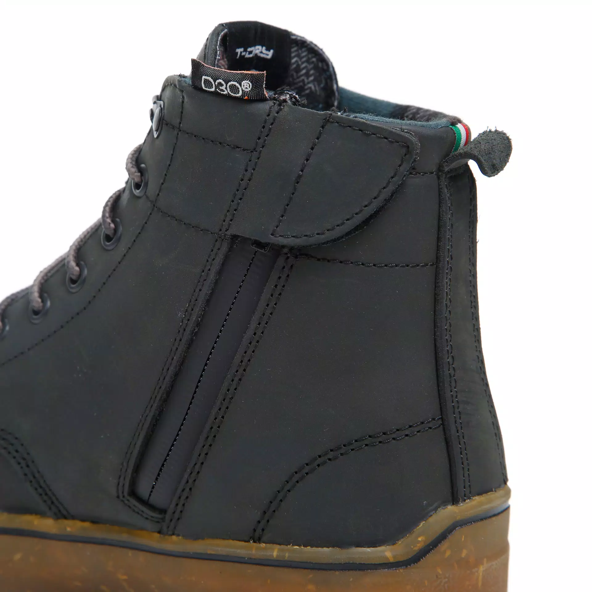 - Застёжка: комбинированная система — шнуровка + боковая молния; эластичная резинка на язычке для укладки и фиксации шнурков.