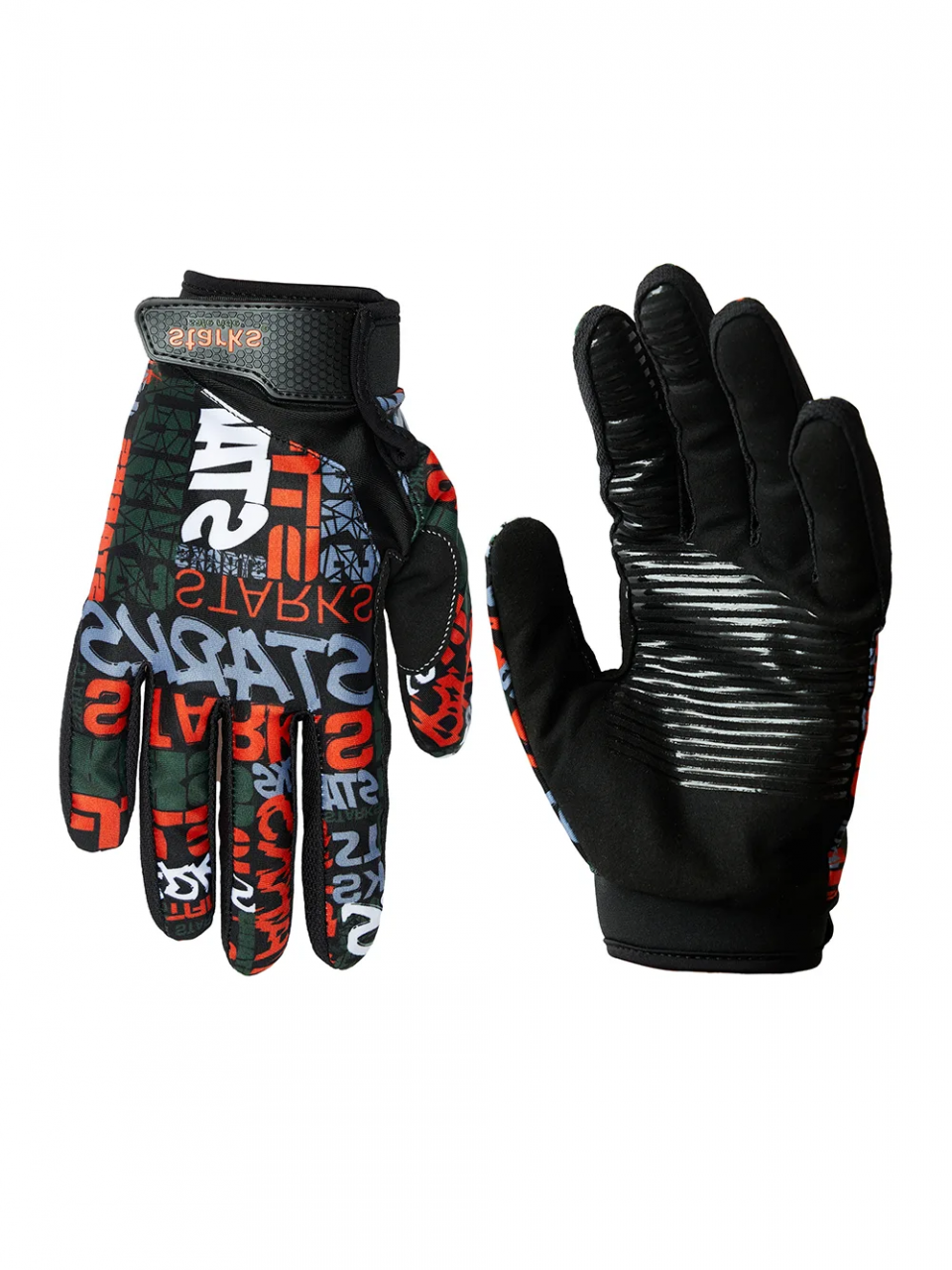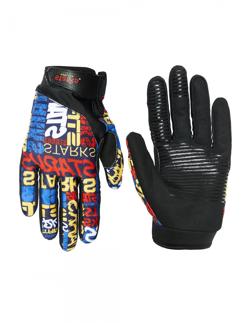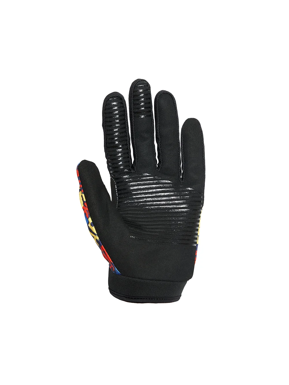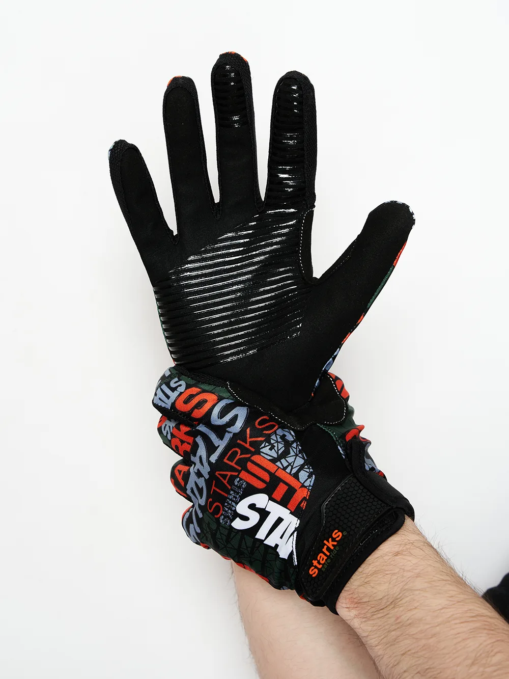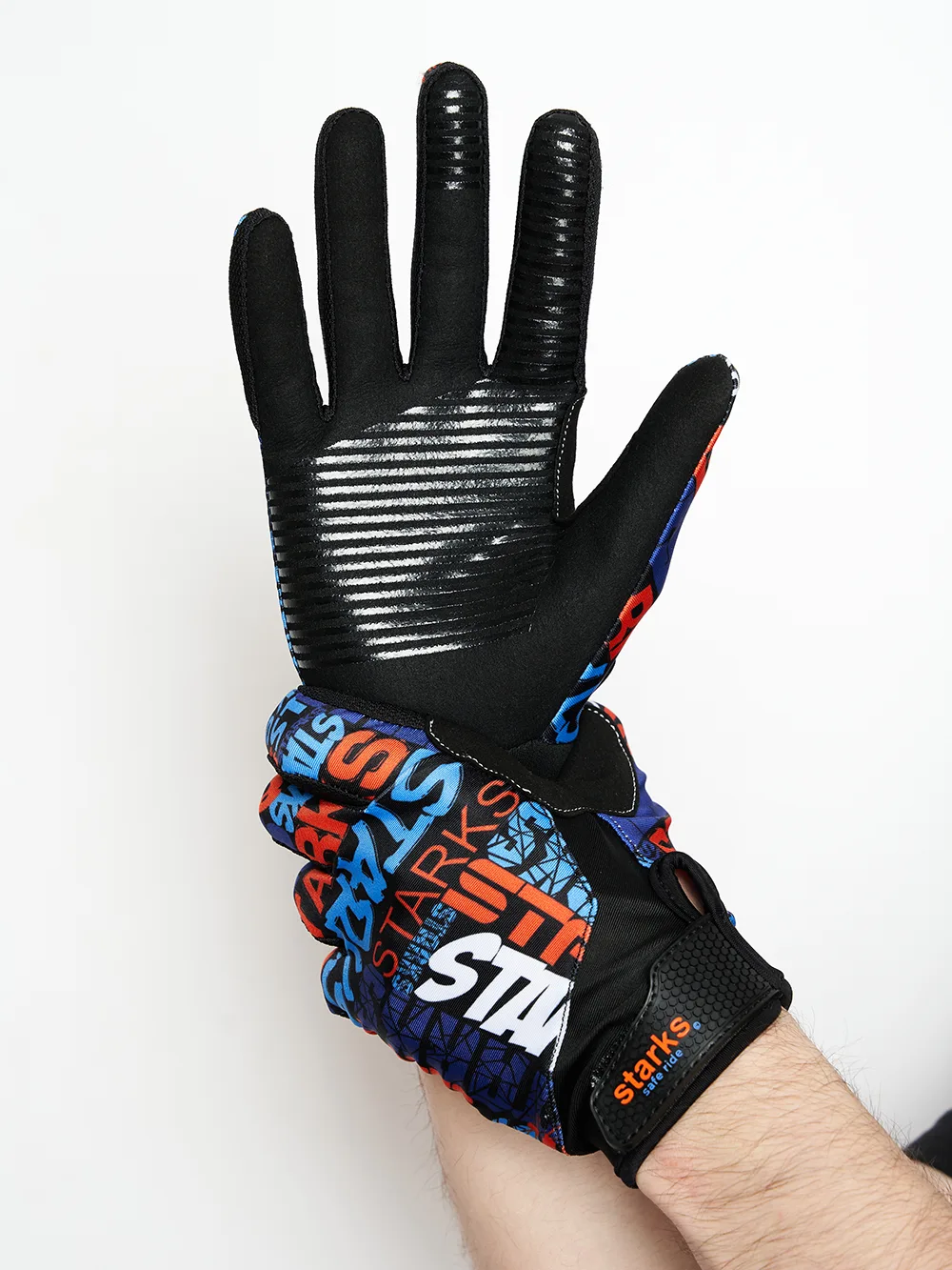 - На ладонях нанесены противоскользящие силиконовые панели для фиксации руки на рукоятке руля.