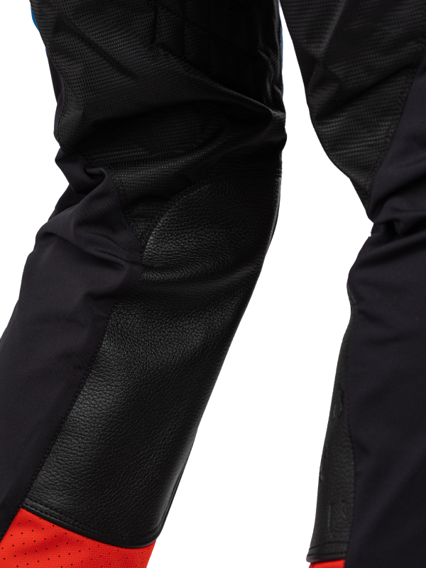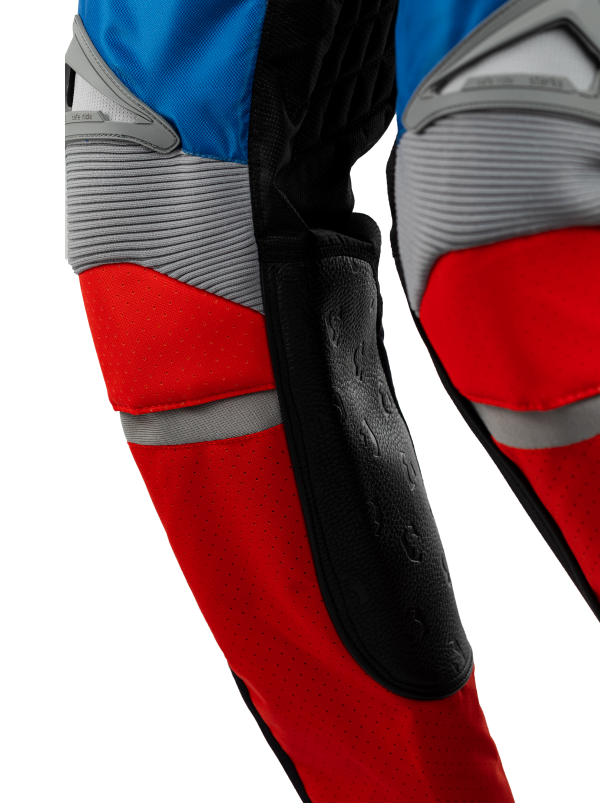- Задняя поверхность бедер штанов детской экипировки для мотокросса оснащена вставками из бифлекса, что позволяет надевать защиту и не создавать излишнего давления