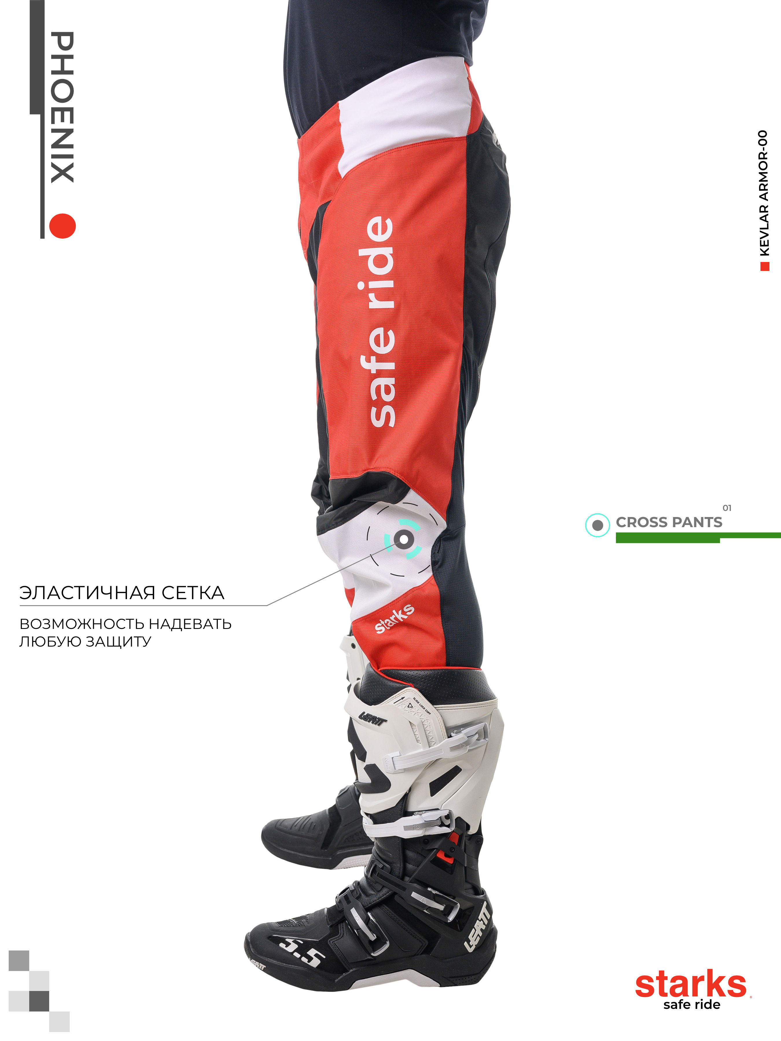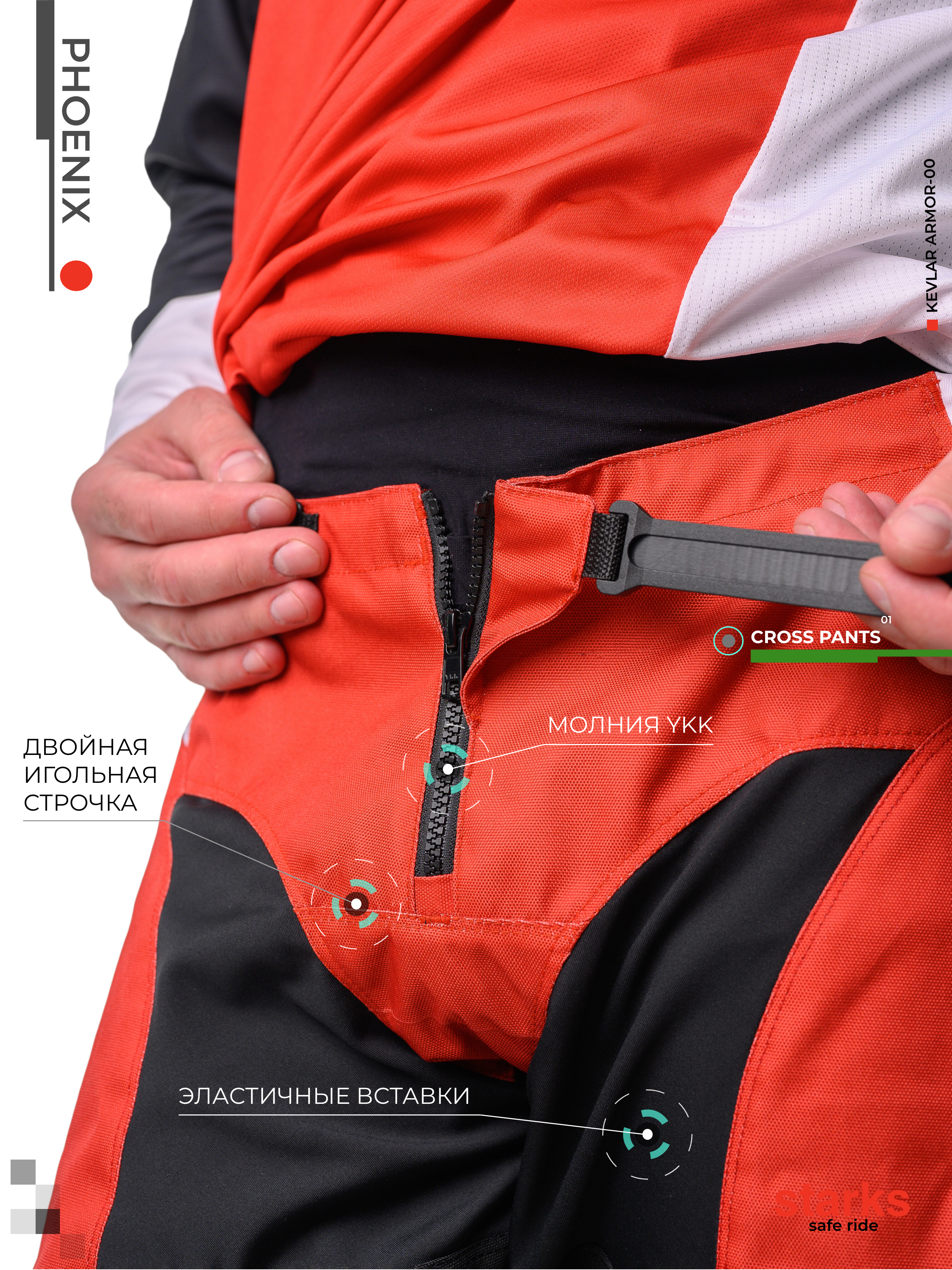 Штаны PHOENIX в специальном крое для эргономичной посадки на кроссовой и эндуро технике. Основная ткань – полиэстер 600D защищает области с высоким уровнем истирания. В местах, где подвижность является наиболее важным фактором, установлены эластичные вставки. Эластичная вставка в области паха и бедер в дополнение к сетке по всей длине ноги сзади дает высокую продуваемость костюма. Внутренняя сетчатая подкладка способствует терморегуляции и комфортного прилегания к телу. Эластичная сетка по всей длине сзади дает возможность одеть защиту любого размера