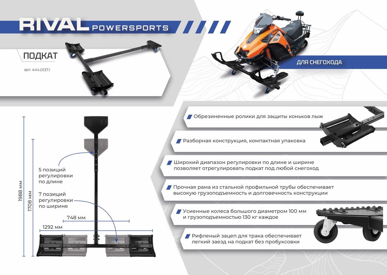 Подкат предназначен для транспортировки снегоходов. Габаритные размеры: длина 1988 мм, высота 1709 мм, ширина 1292 мм (рабочая ширина 748 мм).