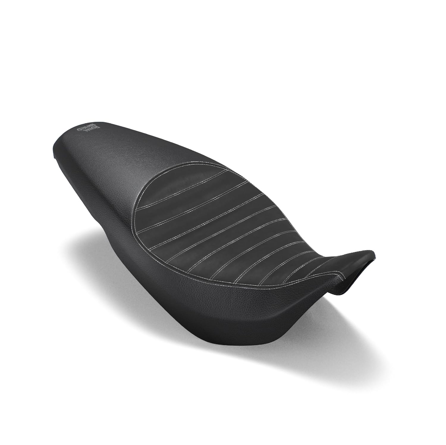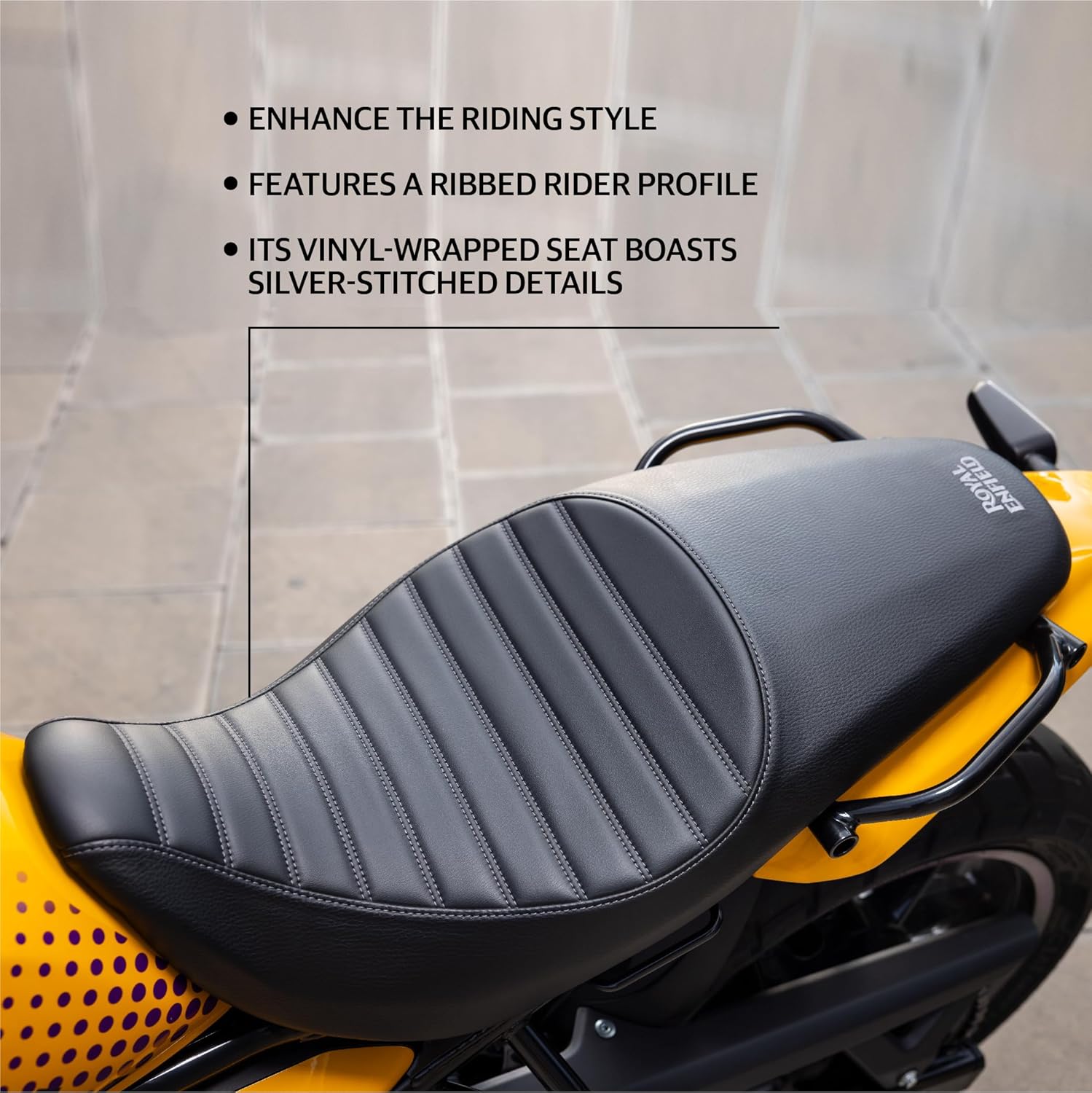 - Дизайн: рифлёный профиль, обтянутый винилом, с серебристой прострочкой и вышитым логотипом Royal Enfield.