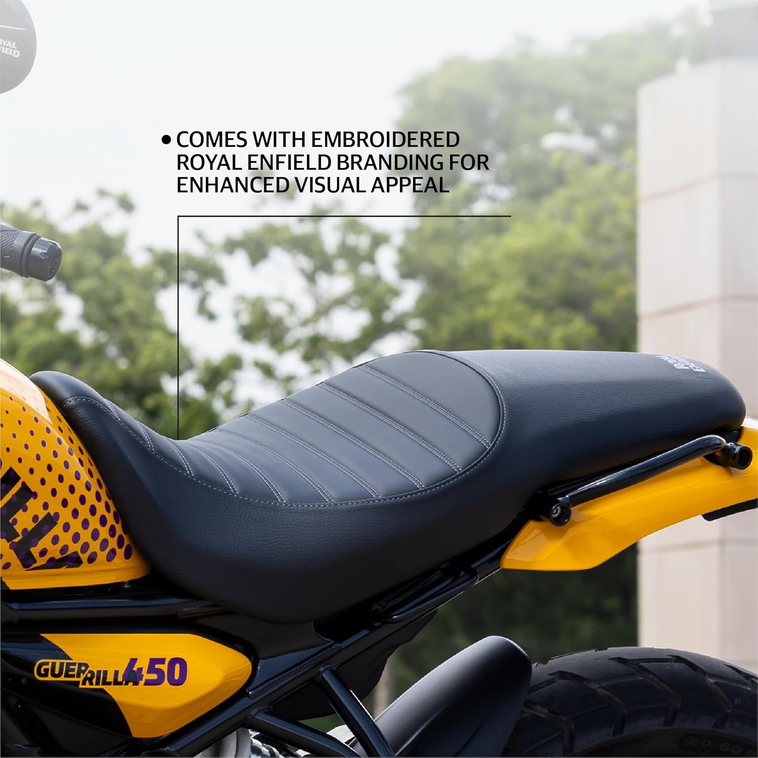 Оригинальное сиденье в стиле Urban Inspirational, разработанное специально для Royal Enfield Guerrilla 450. Подчёркивает индивидуальность мотоцикла и обеспечивает выразительный внешний вид благодаря фирменной отделке и деталям премиум-класса.